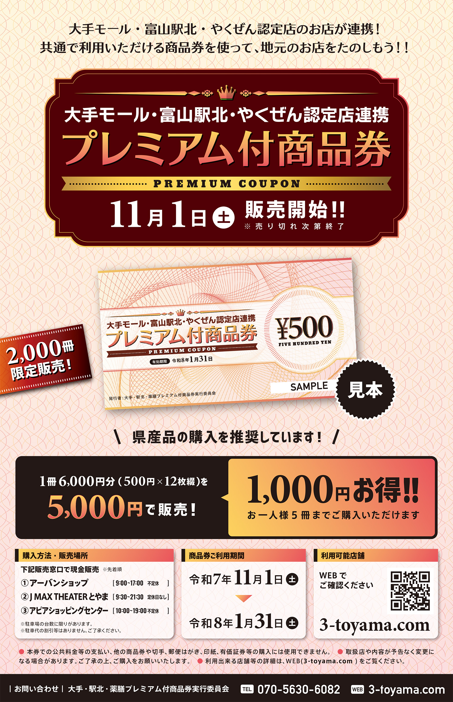 | 5 | JMAX THEATER とやま | 富山市総曲輪3-9-1 電話番号/076-461-5385 営業時間/平日9:00~24:00、土日8:30~24:00(※連休期間や上映スケジュールによりオープン時間が異なる場合がございます。※販売窓口は21時台までの営業となります。) 定休日/なし 当日ご鑑賞の映画チケットのみにご利用可能。お一人様2枚まで/1,000円以上ご利用の方に限る。 ※チケットご予約にはご利用できません。 ※ご飲食/グッズ/前売券のご購入にはご利用できません。 |